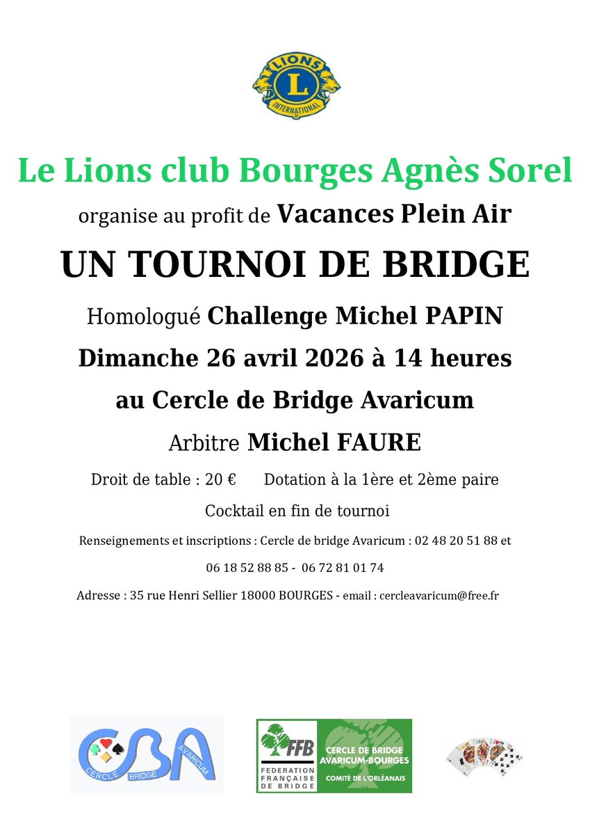 Informations Tournoi Lions Club 26 avril à Bourges
